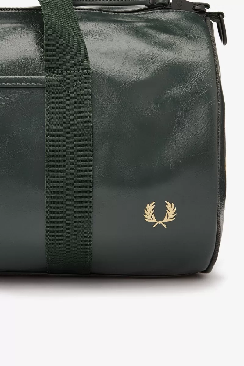 The classic Fred Perry barrel bag in durable PU, designed with tonal detailing. Fitted with strong webbing handles, a zipped compartment at one end and signature arch branding.