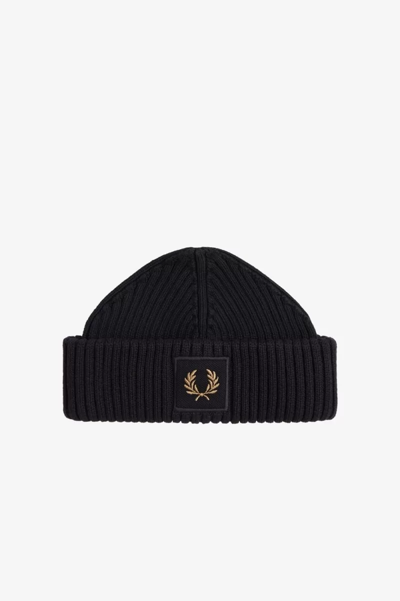 Our ribbed cotton beanie with the Laurel Wreath logo embroidered on the centre patch.