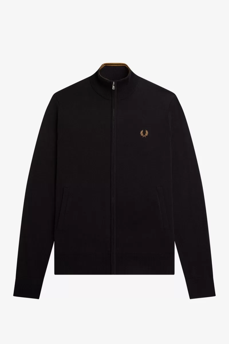 Our zip-through cardigan, crafted from an ethically sourced merino wool blend and featuring subtle Fred Perry detailing.