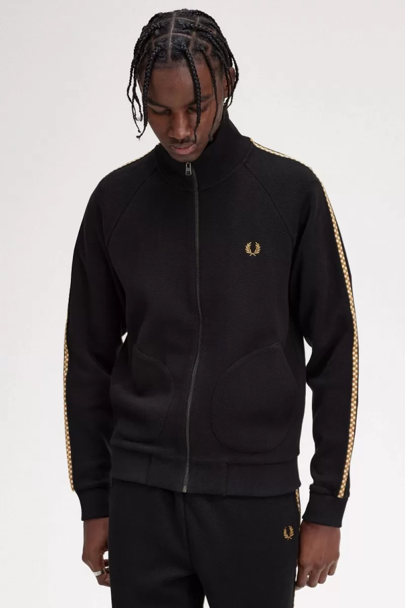 The chequerboard motif is a key design inspiration – a long held Fred Perry theme playing on the sporting grids of tennis nets and the digital squares of nightclub video graphics. Sports meet subculture on the chequerboard tape jacket, with all the familiar detailing, and our classic track taping keeping things on brand.
