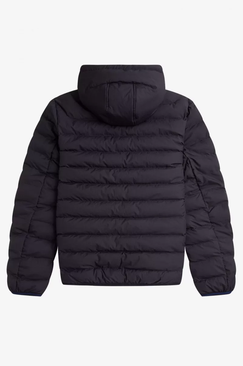 Our smart insulated jacket, constructed from a partially-recycled nylon ripstop, with horizontal quilting and twin tipping to the inside of the hood.