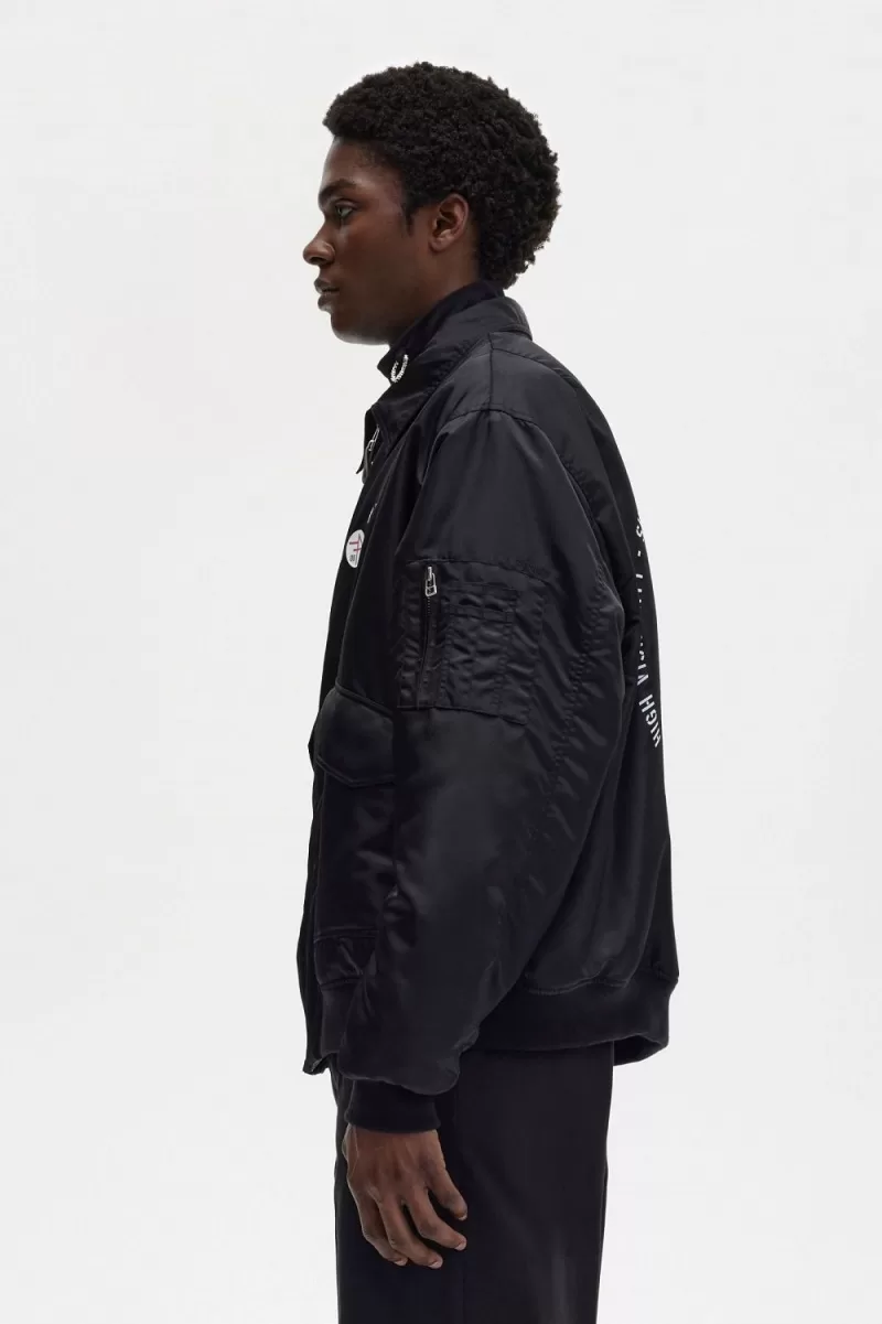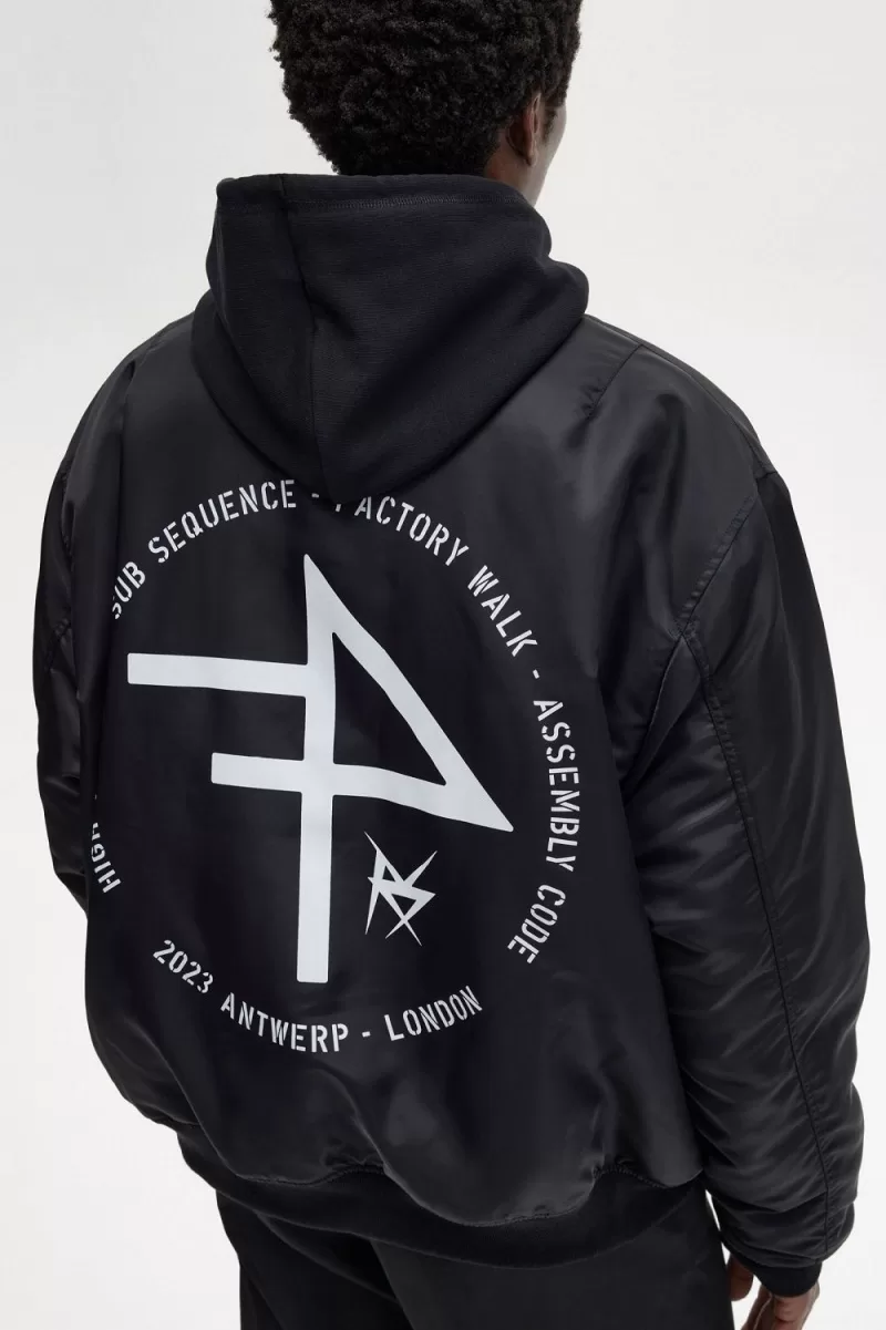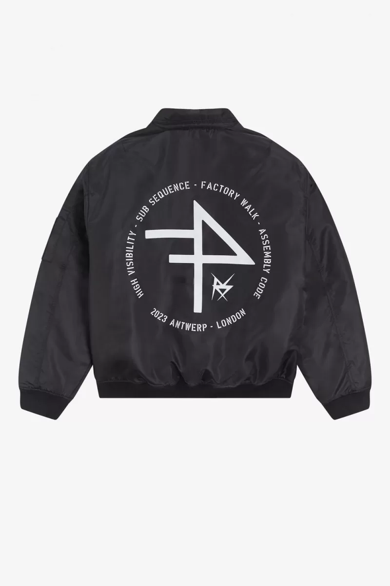 Raf Simons reinterprets familiar Fred Perry silhouettes with the sensibilities of his eponymous line and influenced by the clothes worn at raves, club nights and gigs. Inspired by his fascination with utilitarian uniforms and graphics taken from fictional early industrial records of the late ‘70s, our latest Raf Simons collection is as at home on the floor of a techno rave as it is at a packed band show. We adapt the flight jacket silhouette with a large custom Raf Simons graphic to the back body and a silver metal Laurel Wreath and custom Raf Simons pin badge to the left chest. A reimagined classic that combines conventional style with a rebellious spirit. To wear the Fred Perry x Raf Simons collection is to feel part of something – the power of youth and belonging.