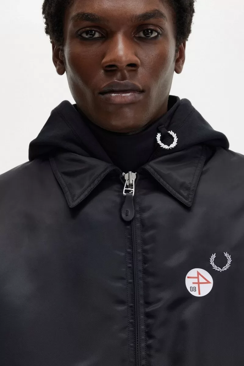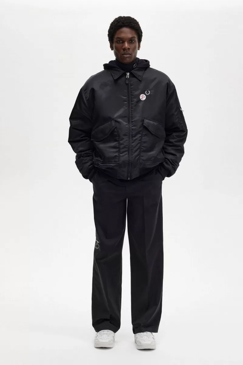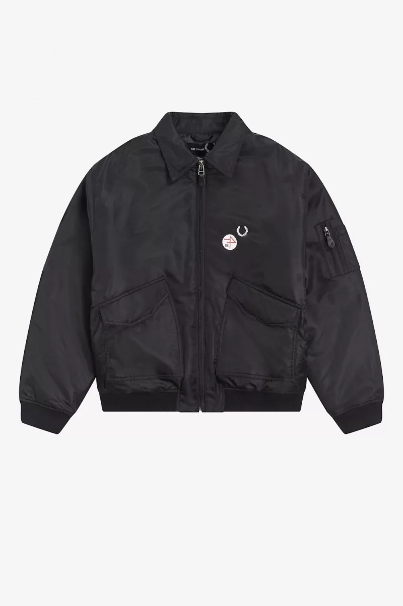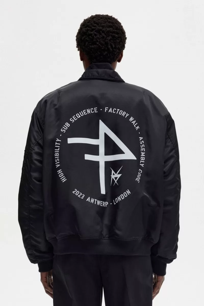 Raf Simons reinterprets familiar Fred Perry silhouettes with the sensibilities of his eponymous line and influenced by the clothes worn at raves, club nights and gigs. Inspired by his fascination with utilitarian uniforms and graphics taken from fictional early industrial records of the late ‘70s, our latest Raf Simons collection is as at home on the floor of a techno rave as it is at a packed band show. We adapt the flight jacket silhouette with a large custom Raf Simons graphic to the back body and a silver metal Laurel Wreath and custom Raf Simons pin badge to the left chest. A reimagined classic that combines conventional style with a rebellious spirit. To wear the Fred Perry x Raf Simons collection is to feel part of something – the power of youth and belonging.