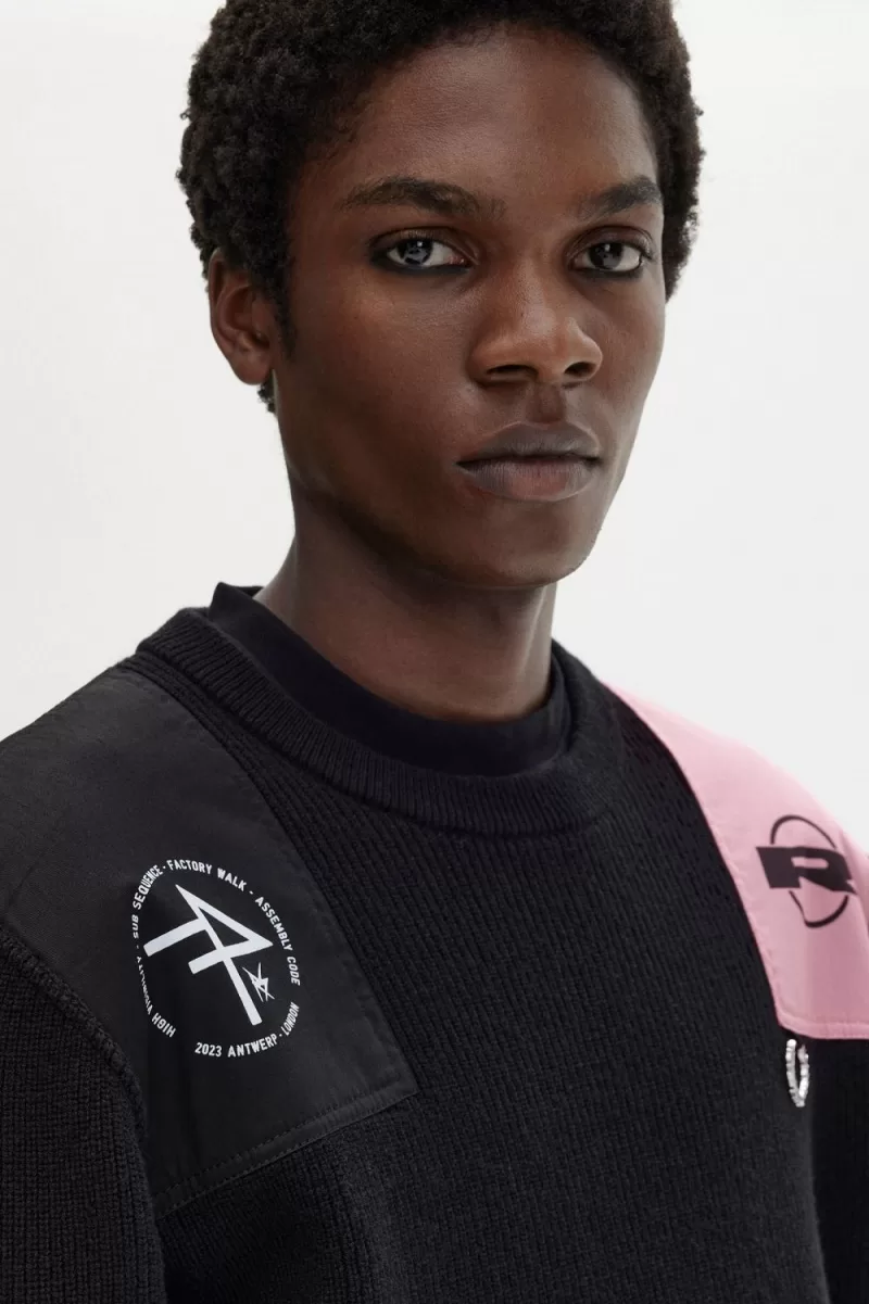 Ethically-sourced non-mulesed wool / Regular fit / Woven cotton patches on shoulders and elbows / Printed graphics on front shoulder panels / Rib crew neck and cuffs