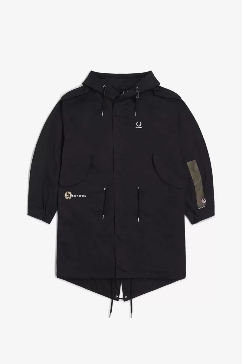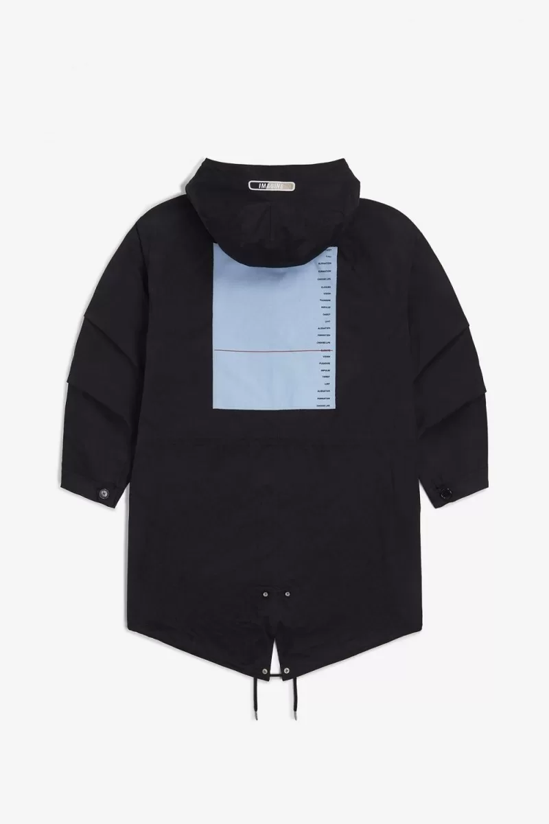 Cotton shell fabric / Oversized fit with fishtail hem and elasticated cuffs with adjuster tab / Drawcords at the hood, waist and hem with shoulder epaulettes / Shaped flap pockets with concealed press stud closure / Bespoke graphic prints on sleeve and back, with hood patch