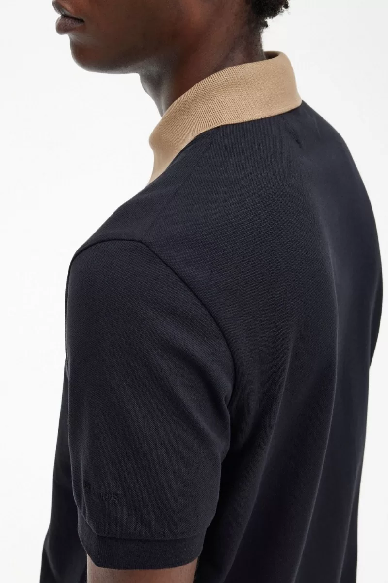Fine cotton piqué / Slim fit / Contrast flat knit collar / Bespoke pin badge to left chest / Laurel Wreath embroidery