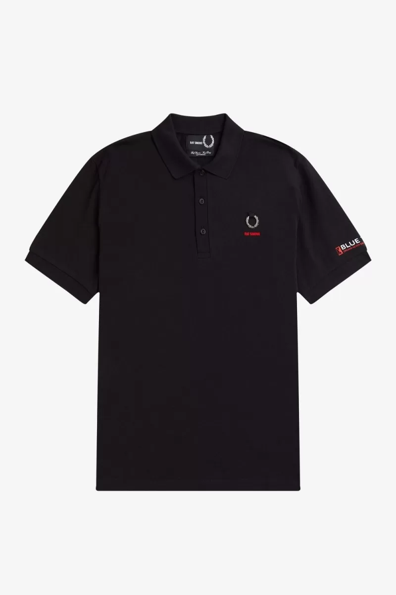 We collaborate with Raf Simons on a slim fit polo shirt, designed with a distinctive metal Laurel Wreath and signature Raf Simons graphics.