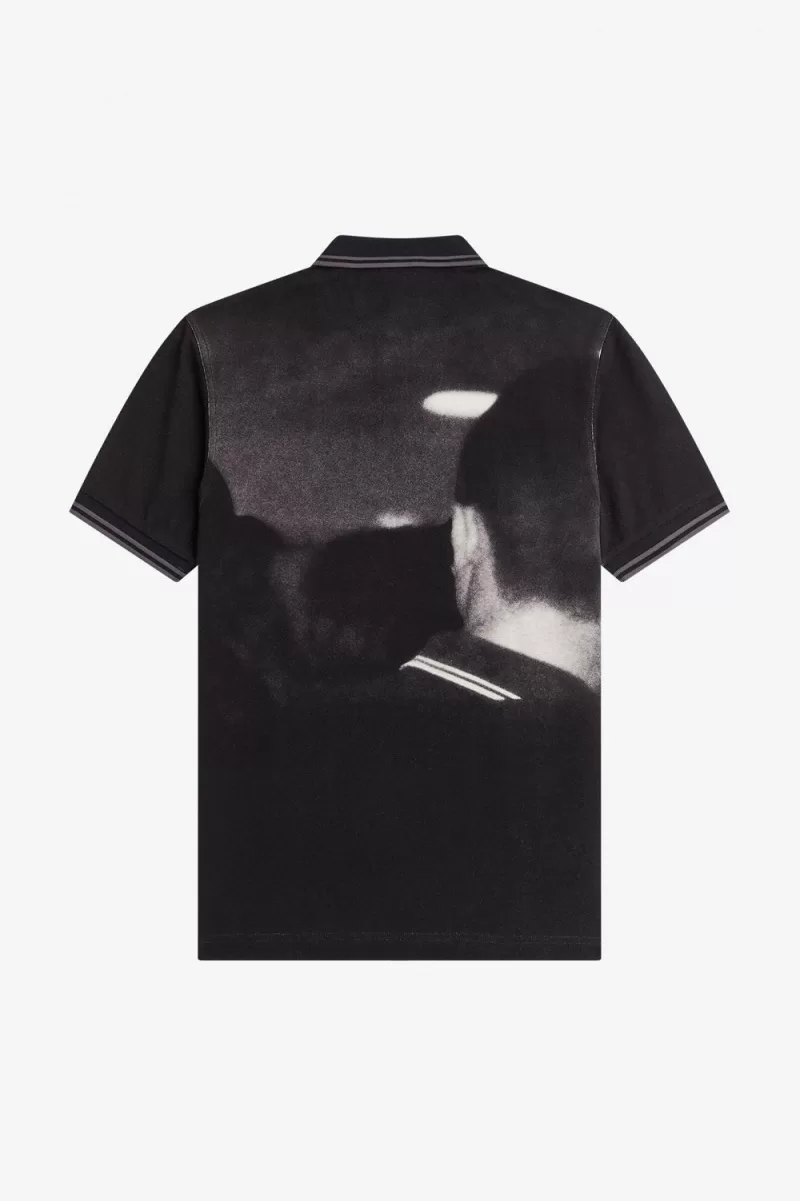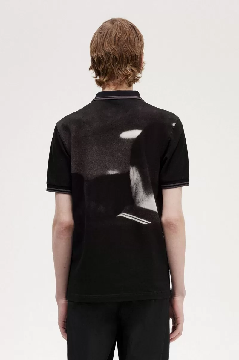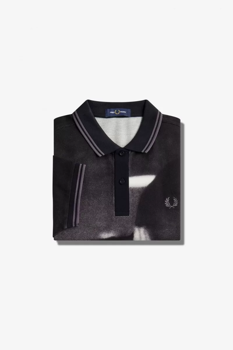 Our rave graphic polo shirt is inspired by the nostalgia of the glitchy, lo-fi tech of the late nineties and early noughties. Handheld cameras, mixtapes, pixelated computers, photocopied nightclub flyers, and pirate radio stations. Hazy memories, city nights, and first holidays. Our rave graphic Fred Perry shirt is a raving staple.