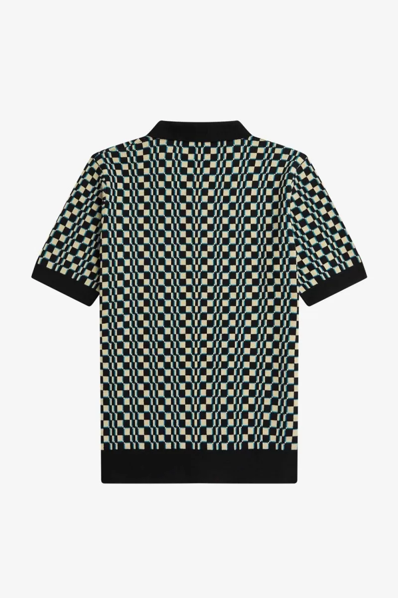 Our glitch print designs reference the screens and soundwaves of the ‘90s rave and techno scenes, when bold colours and abstract shapes took cues from the multi-coloured sportswear appearing across the European tennis circuit. Our glitch chequerboard knit shirt features the signature Laurel Wreath embroidery to the chest. Unmistakably Fred Perry.