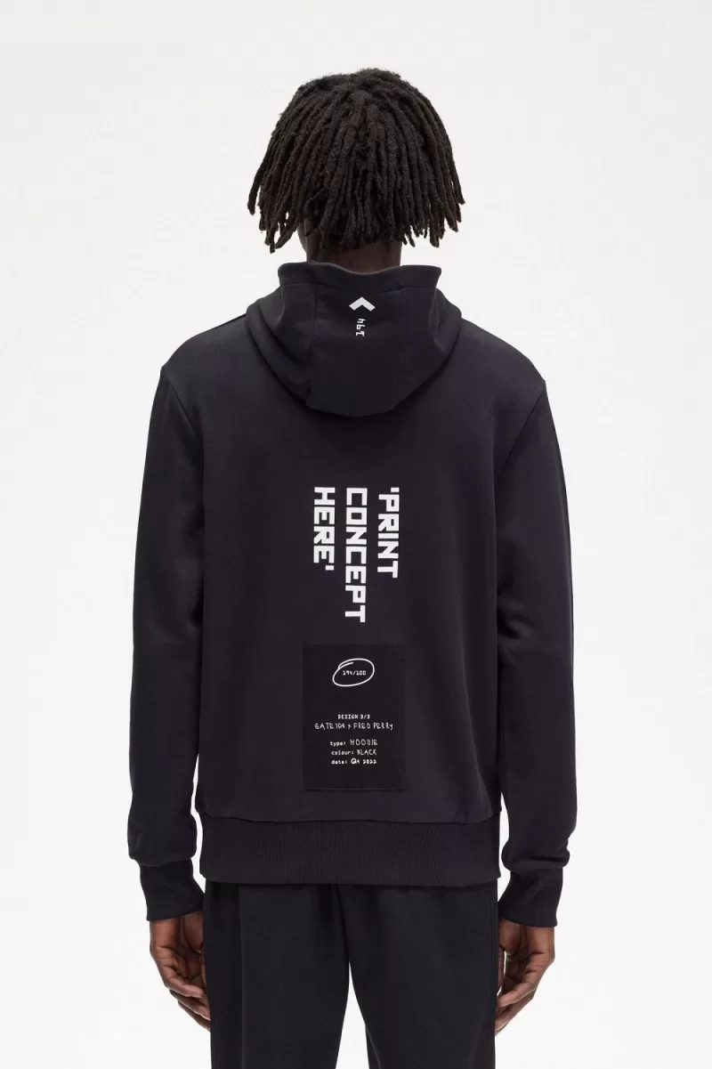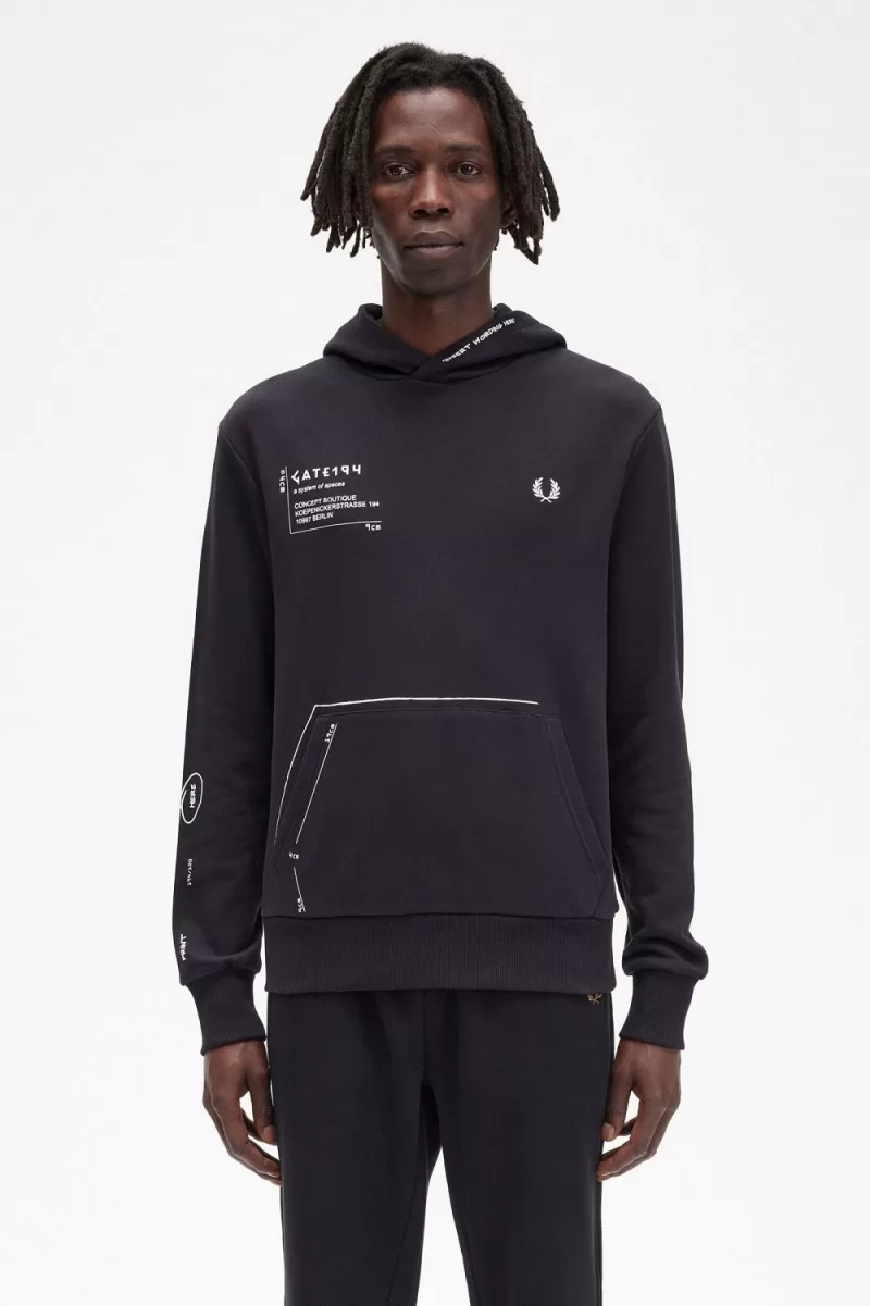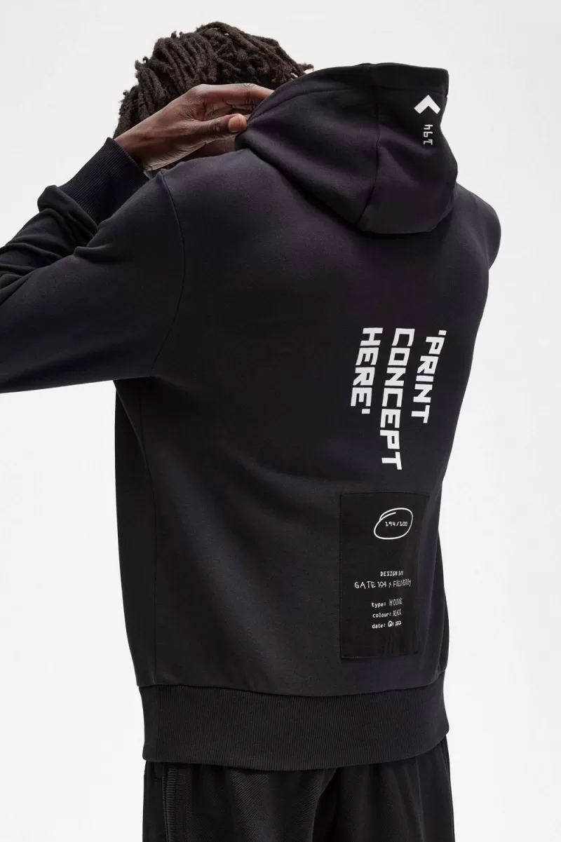 Based in Berlin, GATE194 is an independent concept boutique and long-time Fred Perry stockist, embracing clashing cultures within fashion. Their curated selection of brands places East and West on the same rack, craftsmanship and innovation, luxury with utilitarianism, blending opposites to create something unique. Spurred on by their views of the contemporary fashion industry and its lack of transparency, GATE194 add screen-printed design annotations and placeholders to our hooded sweatshirt, highlighting their creative design process. Made in Portugal with refined features that embody GATE194 and their vision.