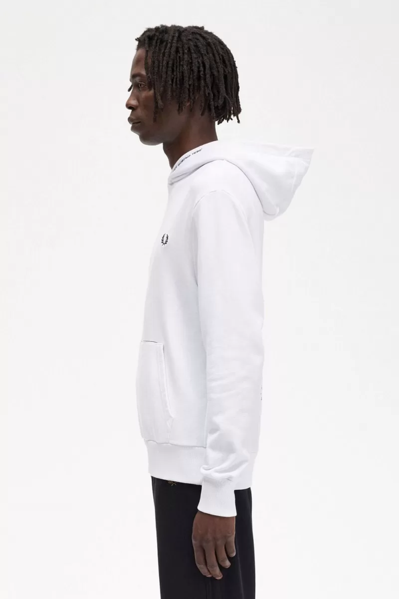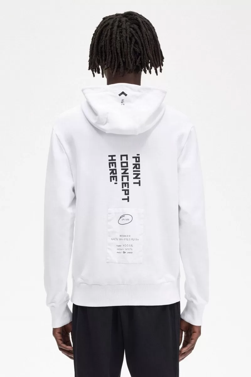 Based in Berlin, GATE194 is an independent concept boutique and long-time Fred Perry stockist, embracing clashing cultures within fashion. Their curated selection of brands places East and West on the same rack, craftsmanship and innovation, luxury with utilitarianism, blending opposites to create something unique. Spurred on by their views of the contemporary fashion industry and its lack of transparency, GATE194 add screen-printed design annotations and placeholders to our hooded sweatshirt, highlighting their creative design process. Made in Portugal with refined features that embody GATE194 and their vision.