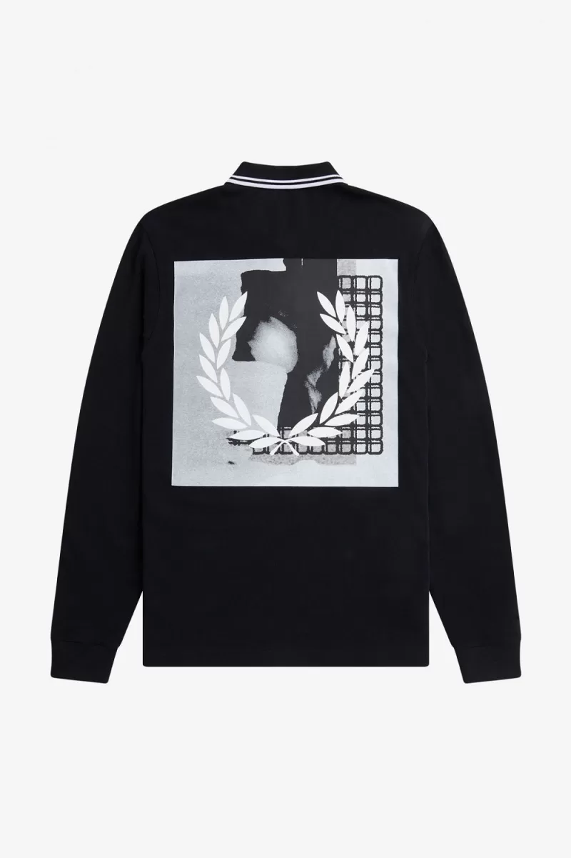 Our latest collection takes inspiration from British night life, where music and fashion collide. It champions individuality as much as togetherness. It’s the whole experience of going out – the outfits you spent weeks planning, the buzz on the bus journey there, the strangers who become mates in the smoking area, the unrivalled joy of being together on the dancefloor. A bold, high contrast print covers the back of our rave graphic long sleeve Fred Perry shirt, with an embroidered logo on the left hand chest projected in oversized relief on the back.