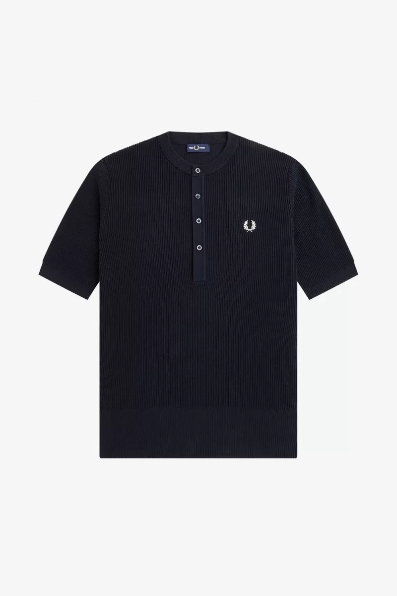 Inspired by the sharp, clean lines of modernist, our knitted shirt is gassed for a smooth and sharp finish. Designed with a Henley-style neckline and lengthened placket, inspired by the sport to sharp cross-over at the heart of Fred’s original designs.