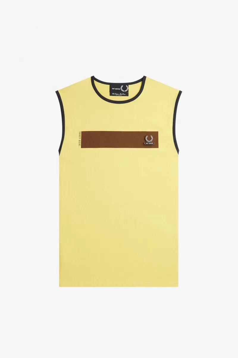 We collaborate with Raf Simons on a cotton jersey vest with dual branded enamel pin and bold colour-blocking to the chest.