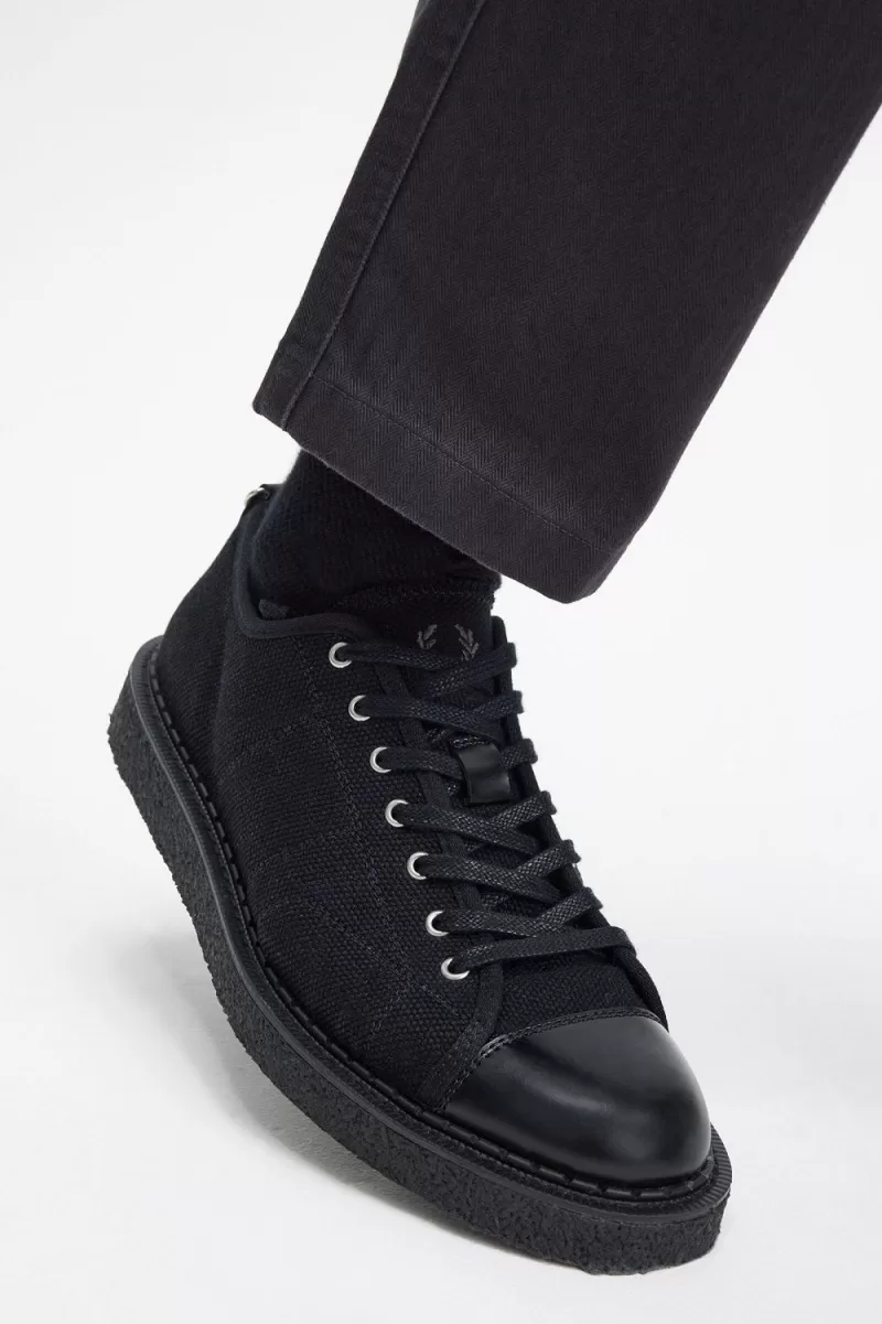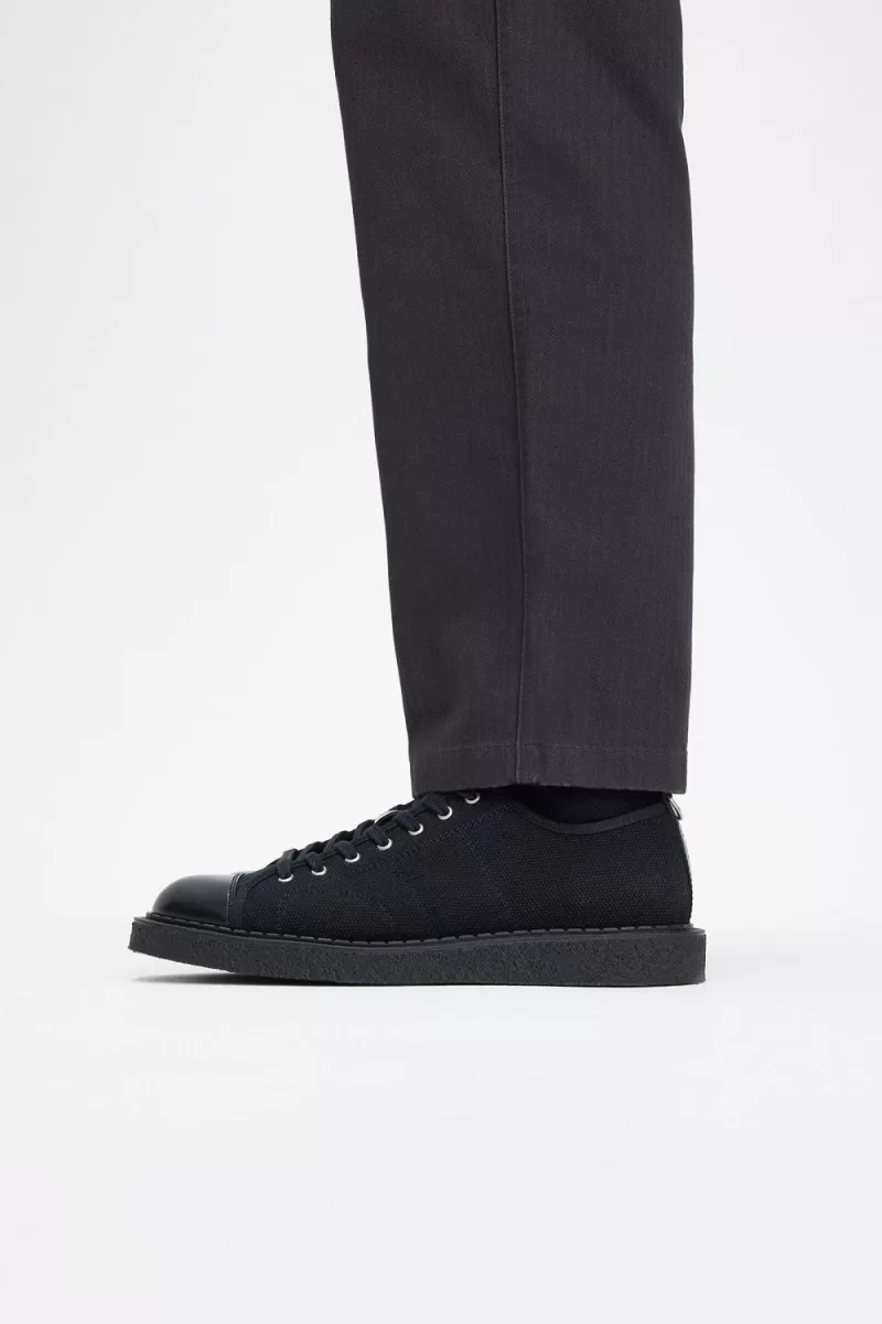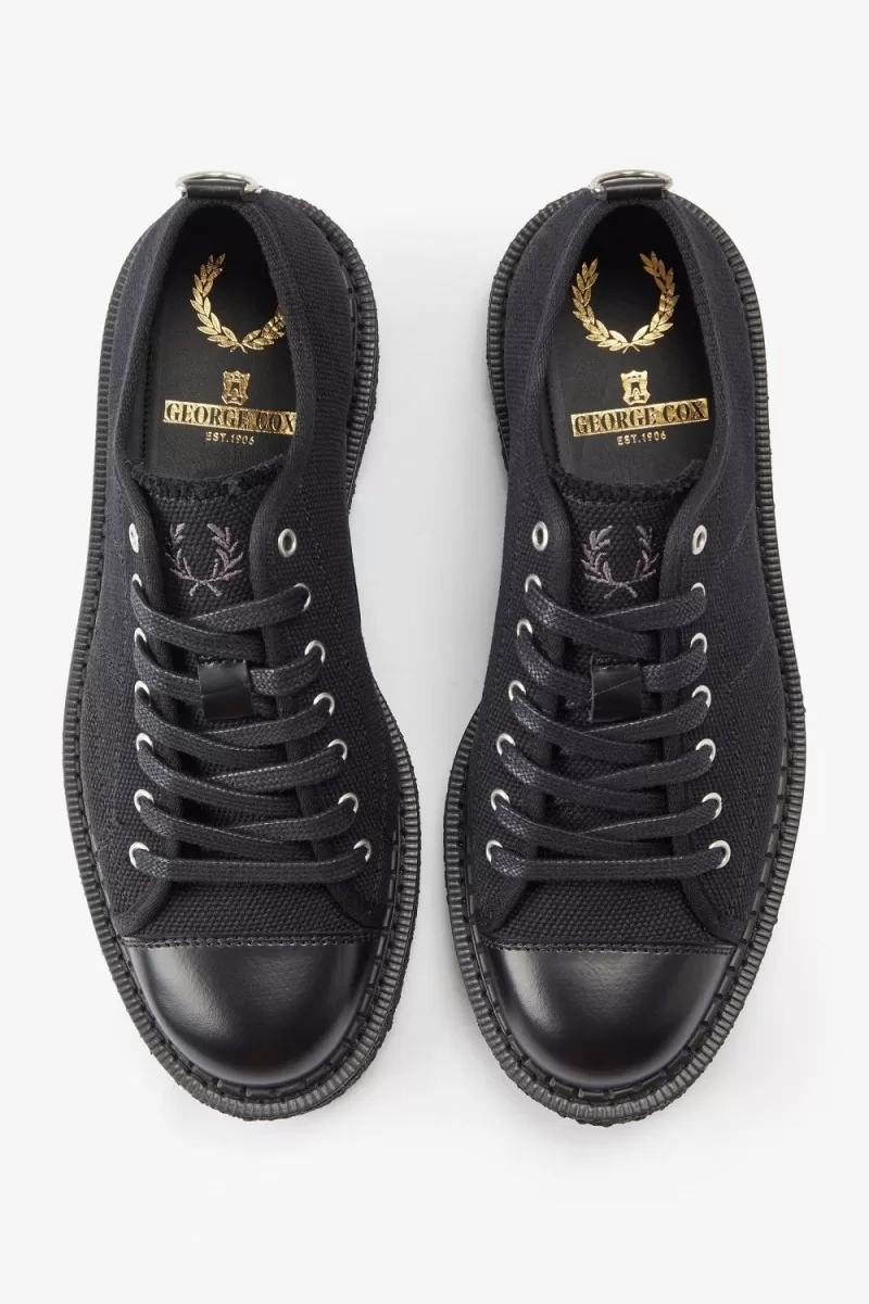 We collaborate with iconic British shoemakers George Cox on an unapologetic new take on the monkey boot, designed with a low profile and details inspired by the Fred Perry plimsoll. Constructed with a heavy canvas upper, substantial creeper sole and leather toe-cap.