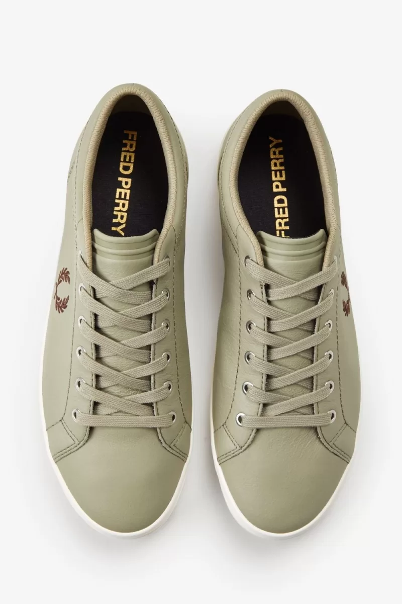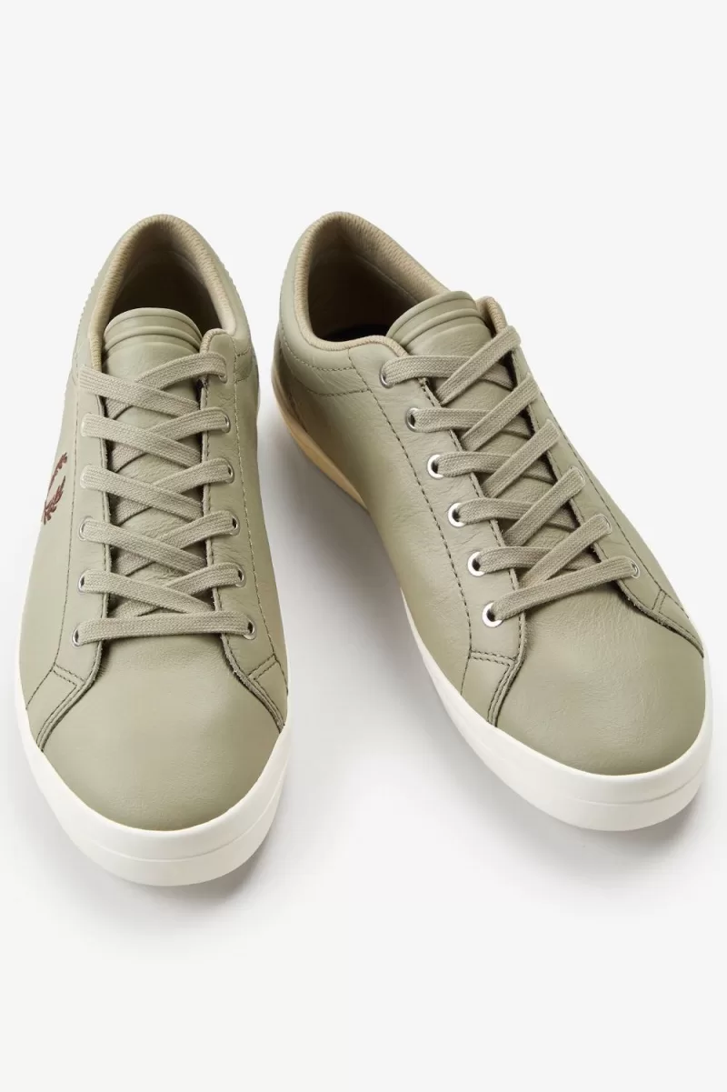 Our Baseline tennis shoe in leather, finished with our signature twin tipping and an embroidered Laurel Wreath to the quarter panel.
