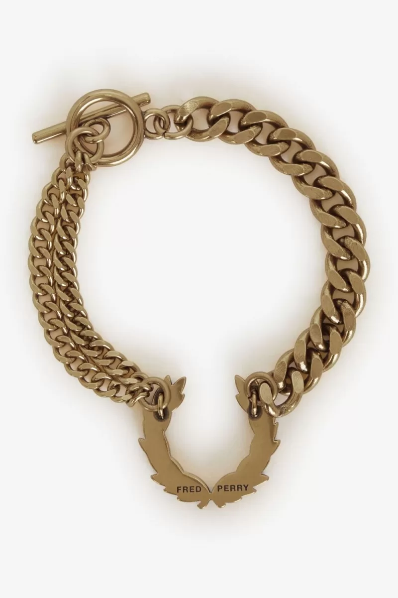 Our chunky, gold-plated bracelet featuring a Laurel Wreath pendant and double chain.
