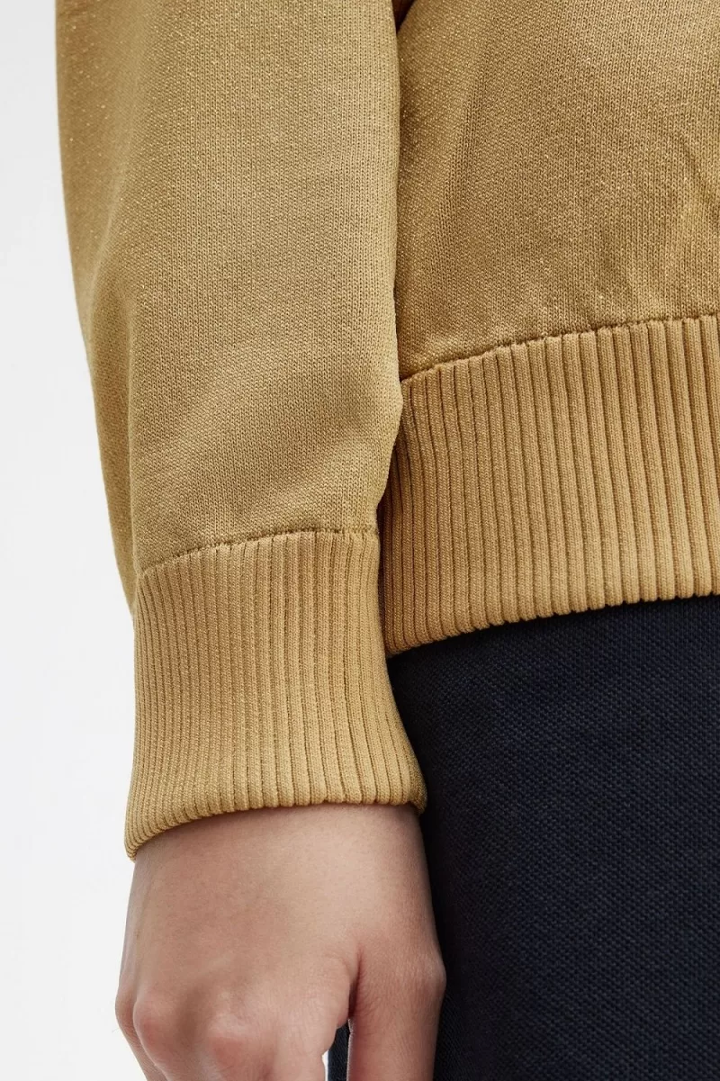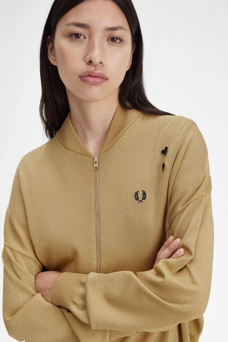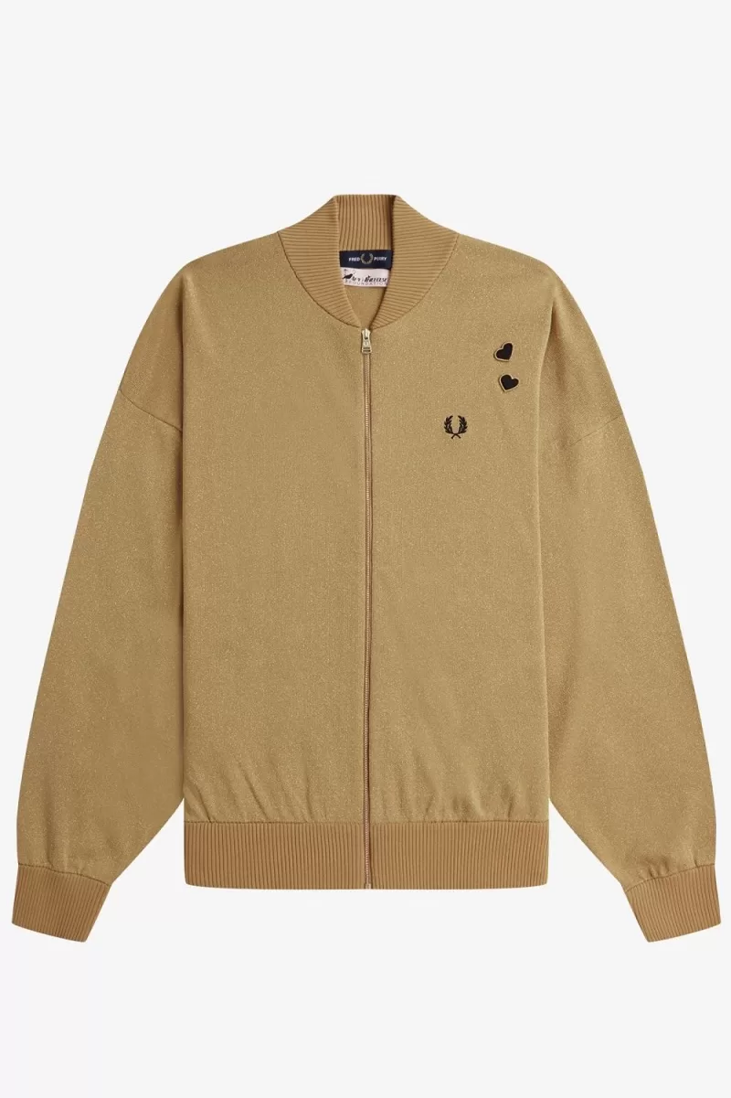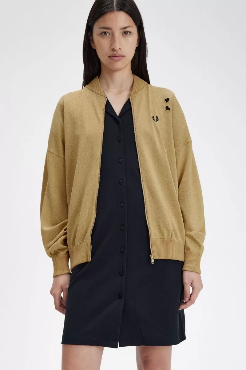 The tennis bomber is a sporting archetype that got recruited into subcultural fashion. Designed as part of our Amy collection, our knitted bomber gets a nightlife-inspired rework. A metallic gold finish ups the ante, referencing Amy’s high glamour days of the 2010s. Knitted in a recycled viscose blend, the relaxed drop-shoulder design is pure Amy. Signed off, as ever, with two embroidered hearts above the Laurel Wreath – a reference to the singer’s tattoos.20% of the net revenue received by Fred Perry for sales of its Amy Winehouse Foundation Collection goes to the Amy Winehouse Foundation (Reg. Charity no: 1143740). In 2022, the donation amounted to £499,695, and throughout the course of our partnership we’ve donated over £2 million. The Amy Winehouse Foundation is a registered charity in England and Wales set up in the memory of the late singer, working to inspire children and young people to build their self-esteem and resilience, so that they can flourish.