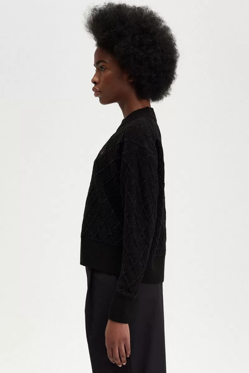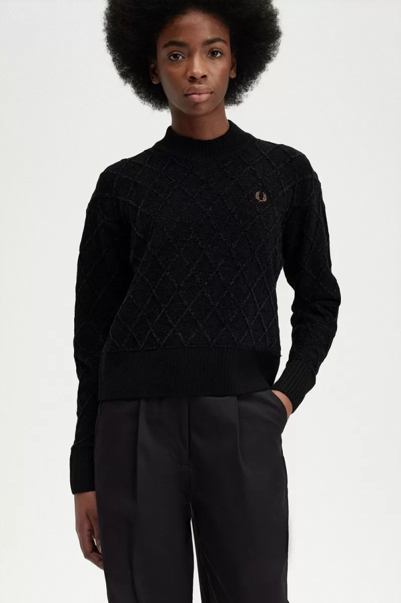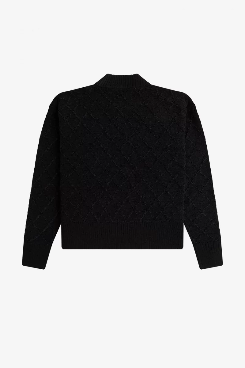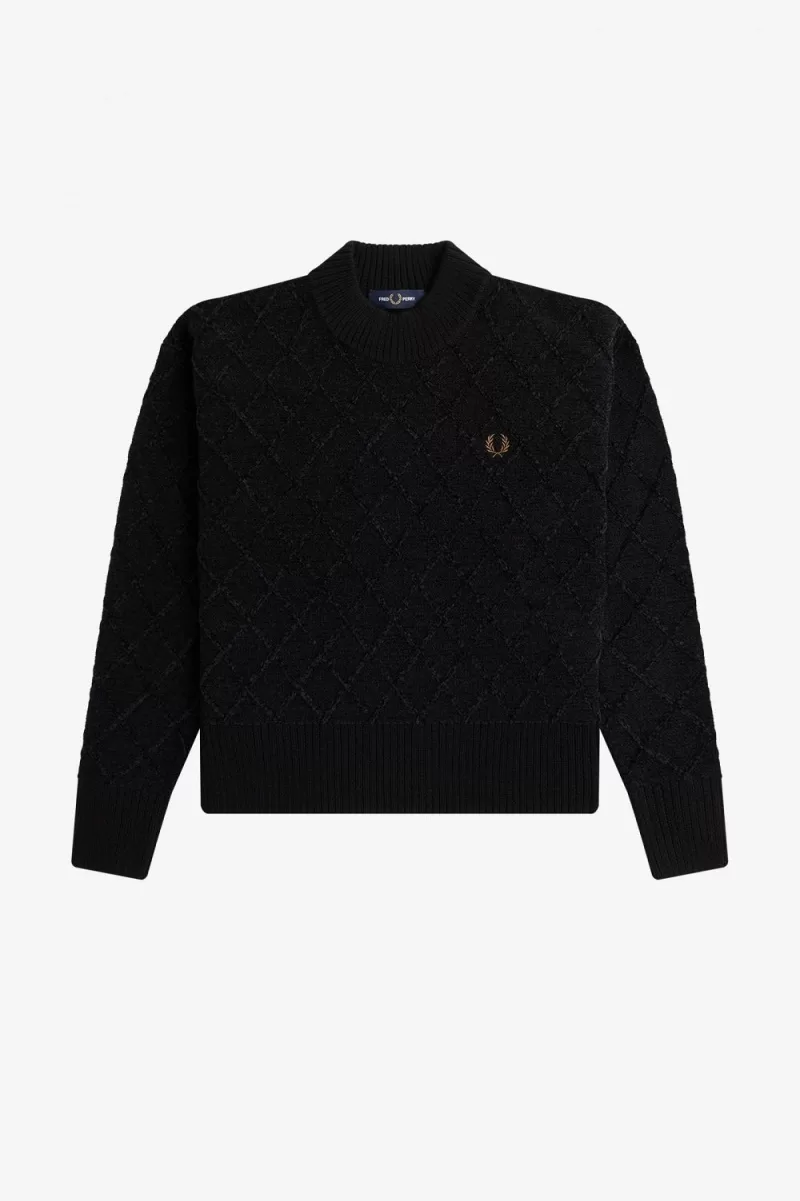 Recycled polyester, wool, and acrylic blend knit / Oversized fit / Mock neck / Chenille with cable knit detail / Embroidered Laurel Wreath to the left chest