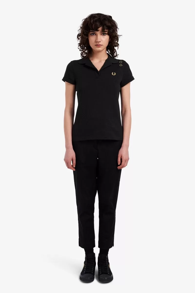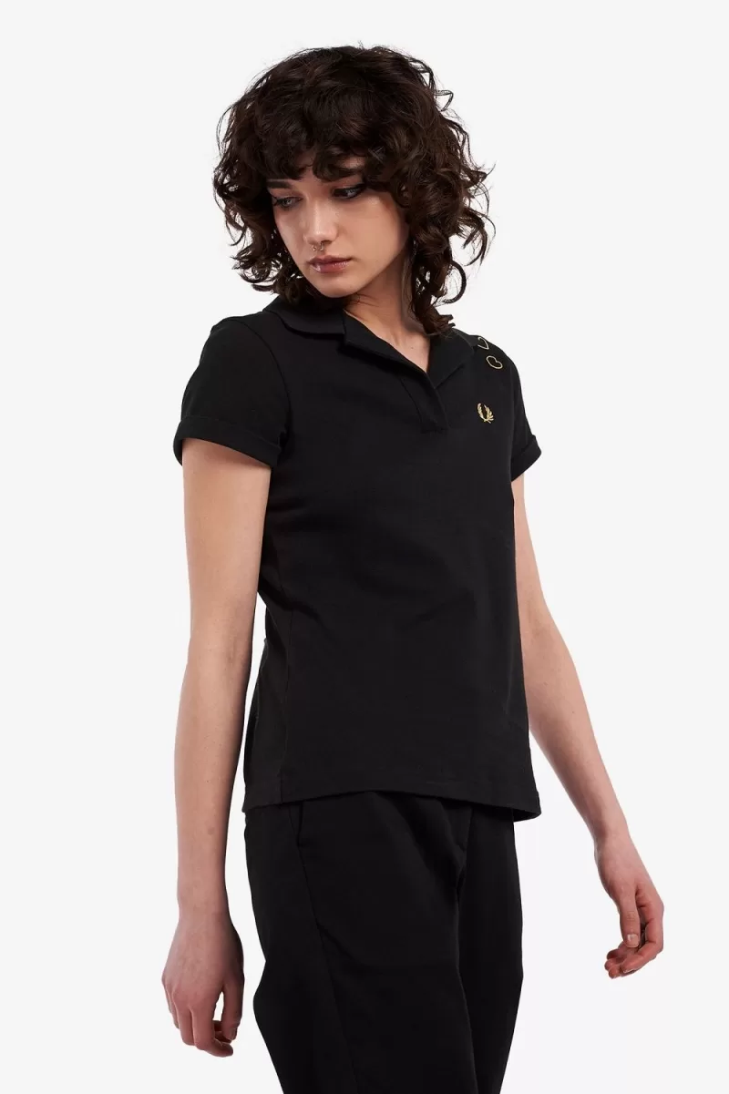 Referencing Amy’s original designs for us, our piqué shirt features a bowling shirt style open collar and Amy’s distinctive love hearts above the Laurel Wreath.