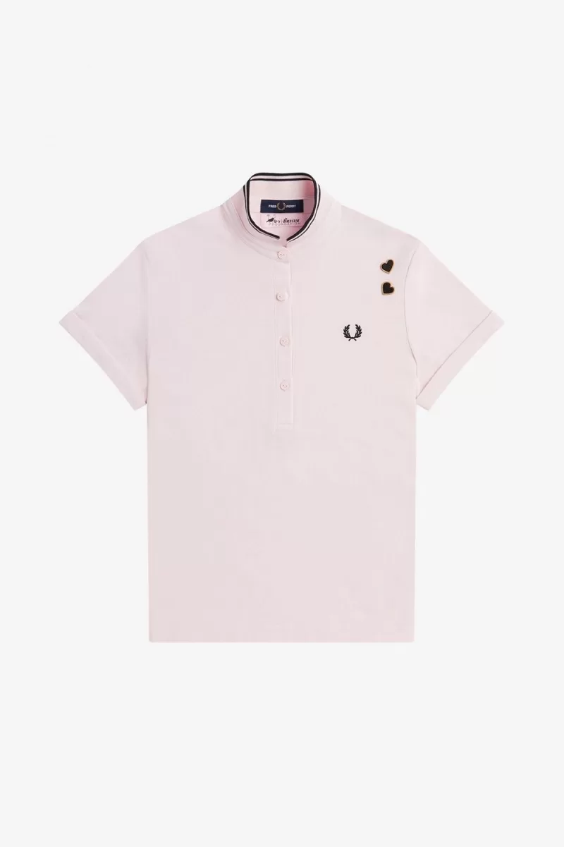 Cotton piqué / Regular fit / Stand collar with tipping / Amy embroidered love heart patches above Laurel Wreath / Slim four button placket