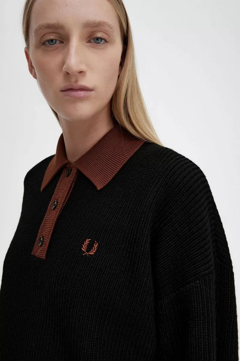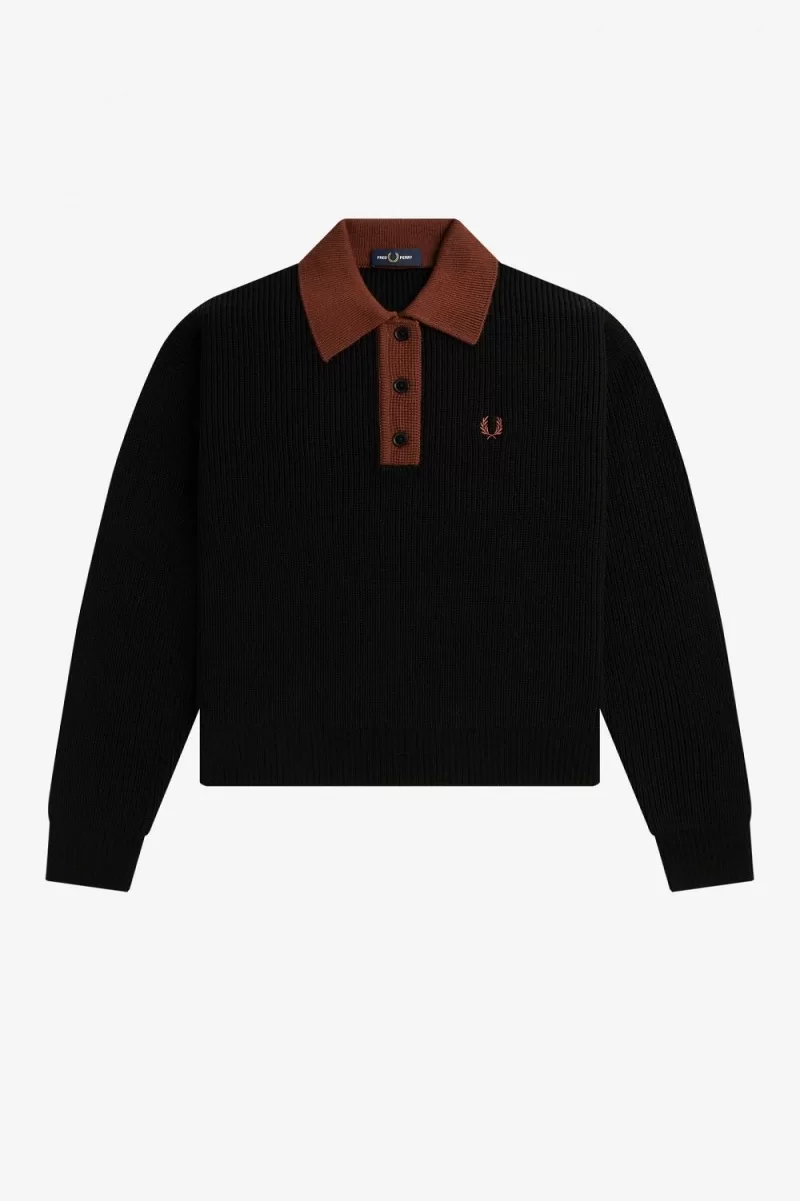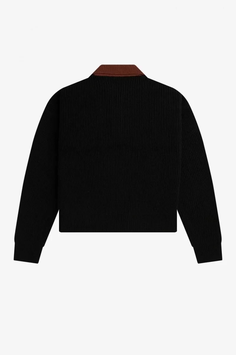 Wool, recycled acrylic, and recycled polyester blend knit / Oversized fit / Ribbed cuffs and hem / Contrast colour placket / Embroidered Laurel Wreath to the left chest