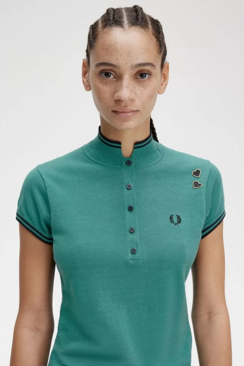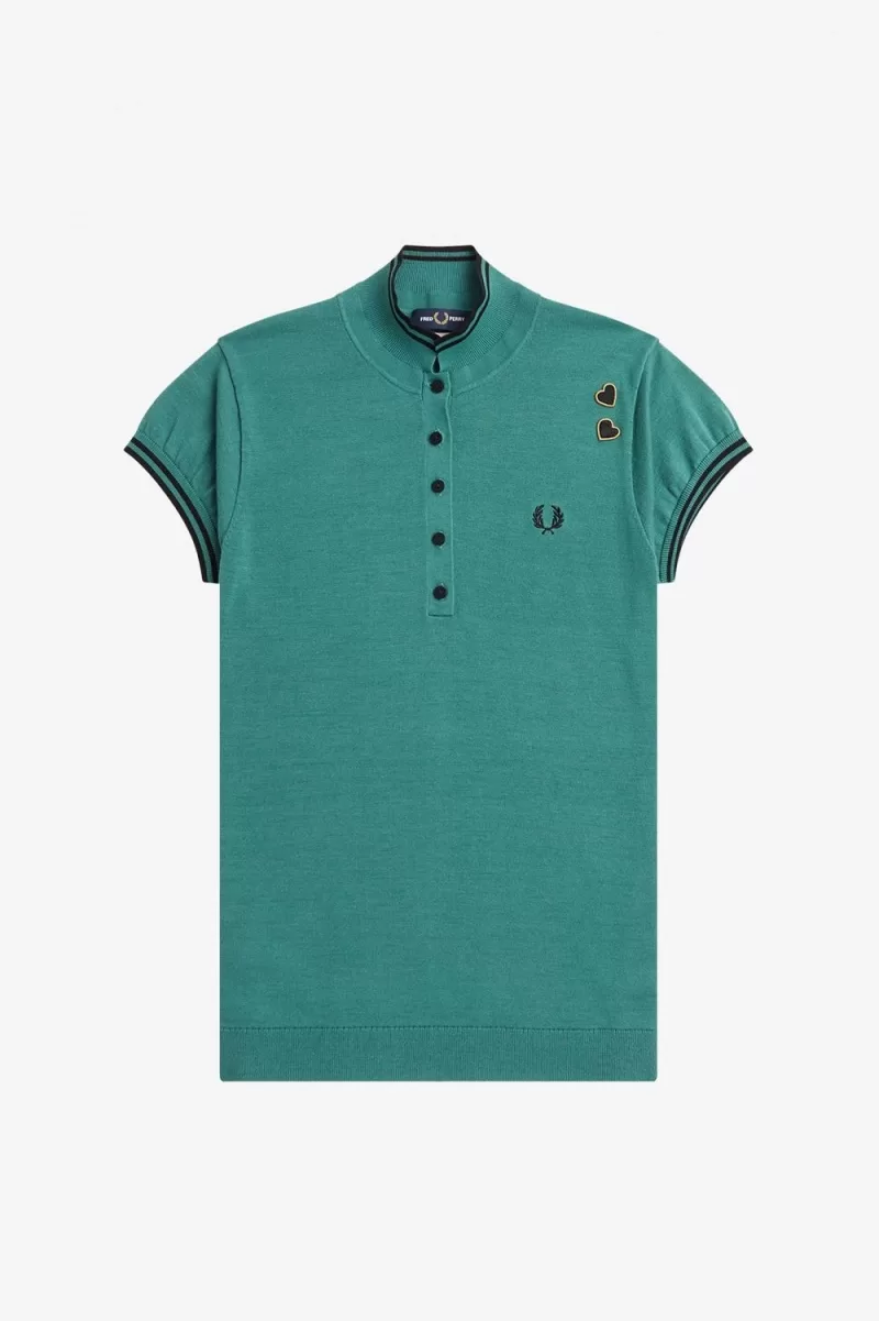 Fine gauge jersey knit fabric / Regular fit with shaped waist / Long slim button placket / Twin tipped collar and cuffs / Amy embroidered heart patches above the Laurel Wreath